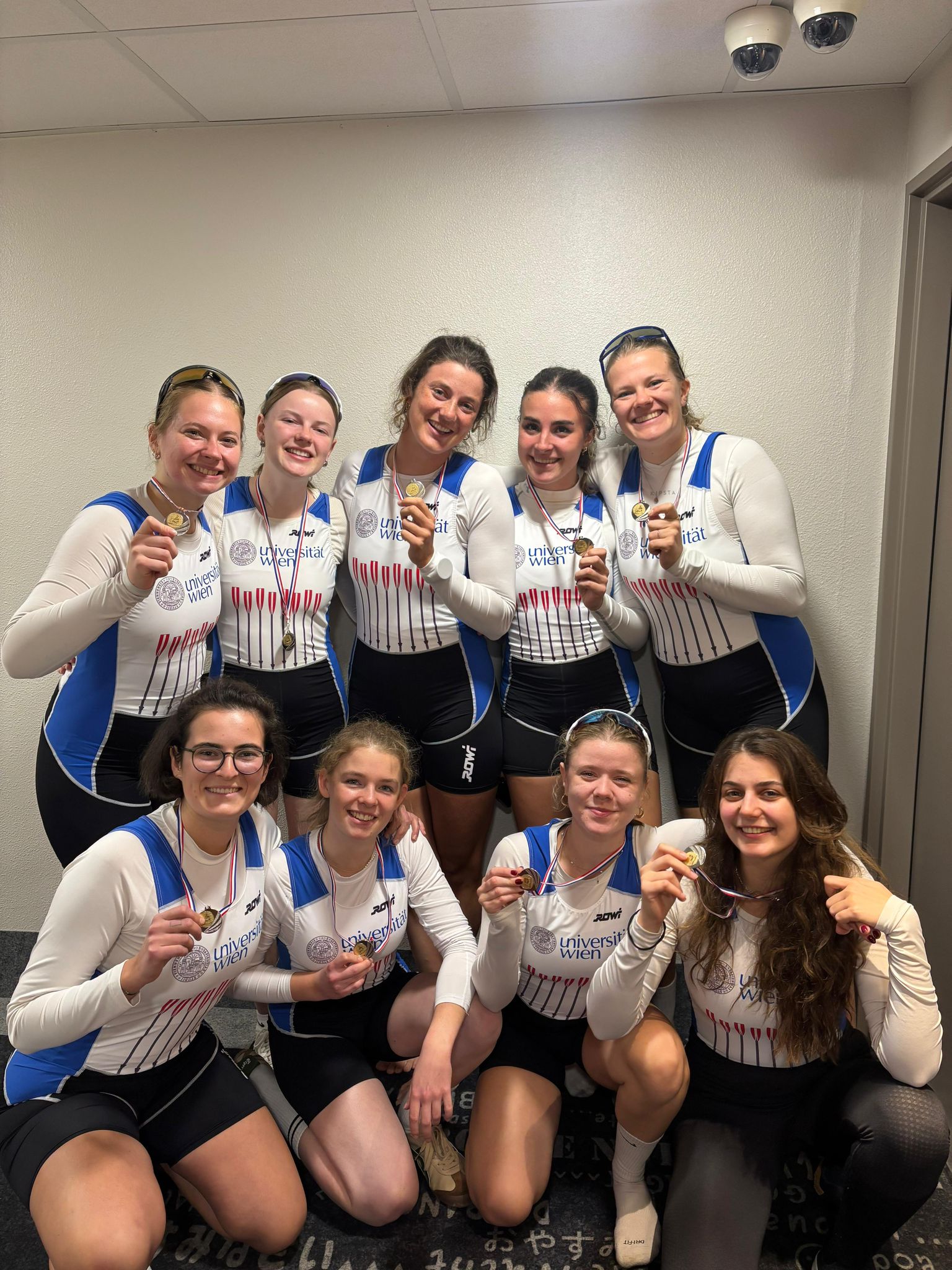 Next up was the W8+ from the University of Vienna, which took first place in the preliminary round with a lead of 8 seconds. The final was held in the afternoon. The five best boats from the preliminary rounds in the morning competed in the final. The final was a very exciting race. The W8+ got off to a strong start and was neck and neck with the HEC boat. But in the last 50 meters, the tide turned and the boat from APT, a French university, put in an incredible final sprint and fought its way to first place. Our W8+ finished second. What a race!